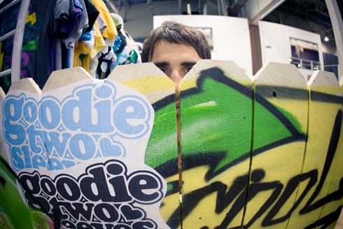 The unofficial theme for this tradeshow season for Goodie was ‘Goodie Two Sleeves Makes You Awesome’. We did a series of pictures and stuff that appeared on our mailers, invites, catalogs and stuff. When deciding how to translate that theme into our newest booth, we decided to use our old booth and have GTS ‘make it awesome’. A bunch of graffiti, wheat pasted stuff, and hours upon hours later we had this uber-bright, ultra-awesome booth that screamed ‘Goodie Made Me Awesome!’ Sheesh, I hope I don’t have to say that line again….